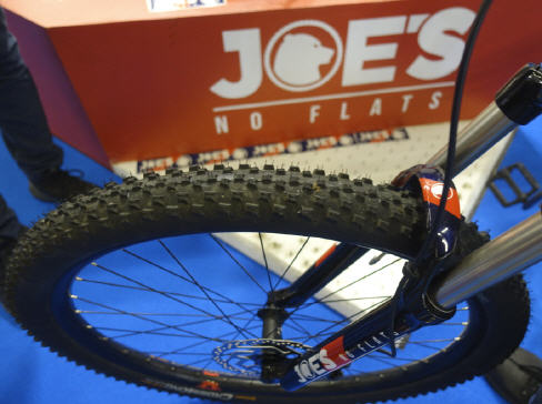 Eine Reifenpanne kommt immer dann, wenn man sie am wenigsten gebrauchen kann. So haben gleich mehrere Aussteller Reifendichtmittel präsentiert. Bei der Firma JOE´S fuhr der Marketing Manager mit einem Mountainbike mehrfach über ein Nagelbrett mit zahlreichen Nägeln, das Dichtmittel dichtete den Reifen im Bruchteil einer Sekunde ab und hielt den Reifendruck. Auch 100 PSI-Rennradreifen, in die man ein etwa 5 mm grosses Loch bohrte, waren sofort wieder dicht. Dr. Wheeler präsentierte ein biologisch abbaubares und umweltfreundliches Reifendichtmittel.
